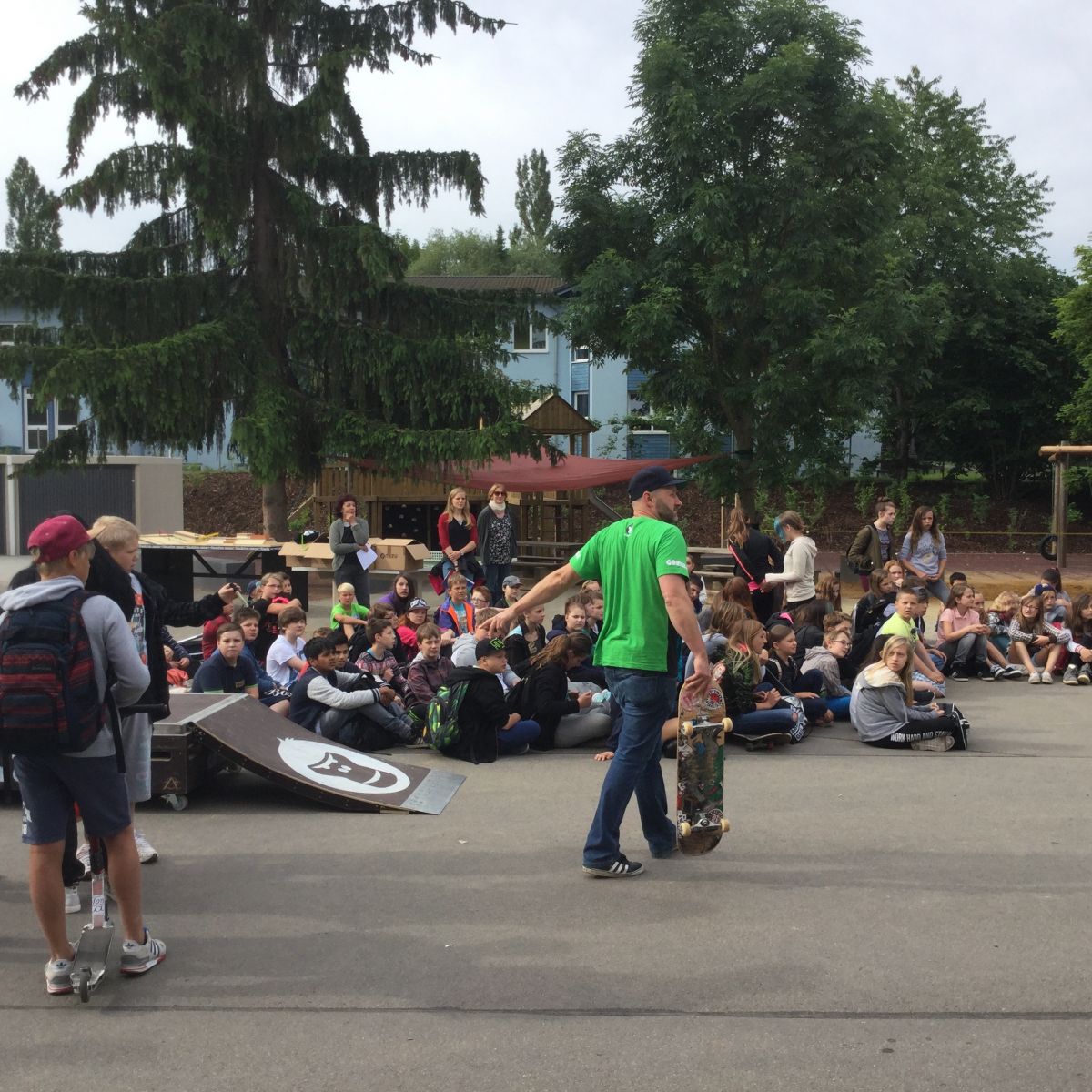 Im Rahmen von „Thüringen denkt bunt“ und als „Schule ohne Rassismus Schule mit Courage“ ist es gelungen, die GORILLAs nach Weimar an die „Musäus“ Regelschule zu holen. Wie die Tourdaten zeigen, waren wir der einzige Stop in Thüringen und die einzige so kleine Stadt! Darauf sind wir mächtig stolz. Sympathischer Chef der 19 GORILLA- Botschaftern ist Tobias Kupfer (Weltmeister im Longboard/Streetskate).