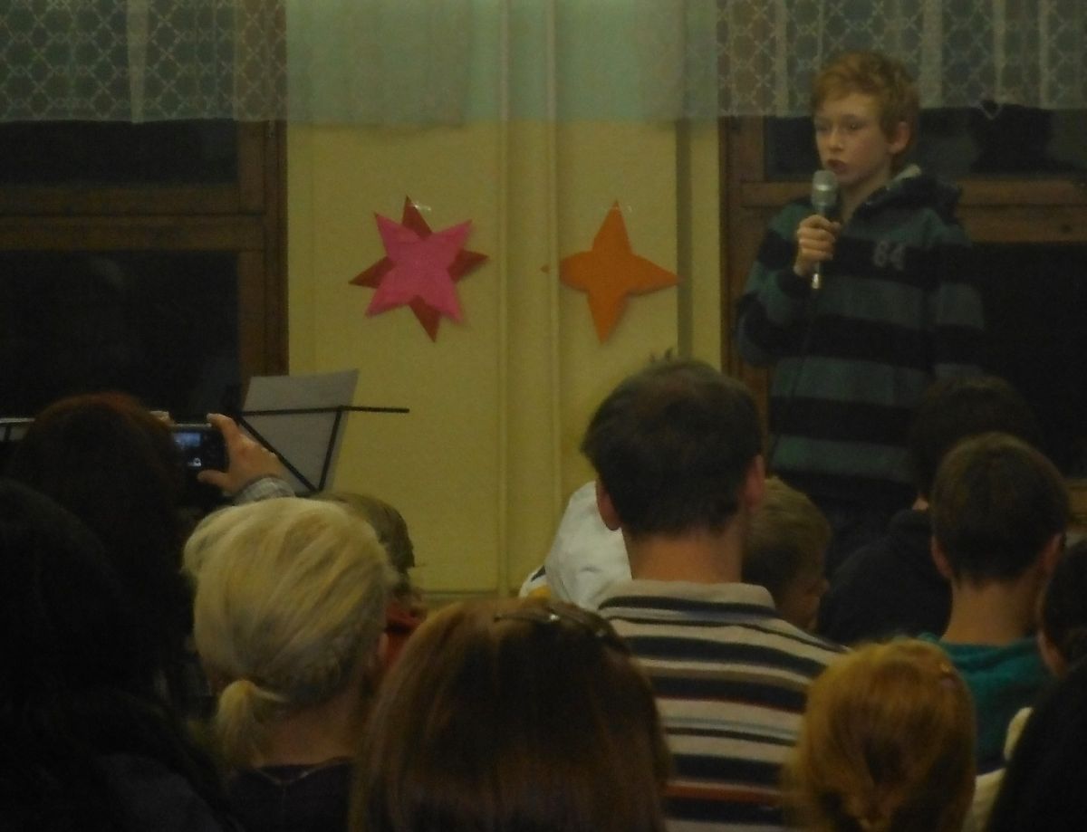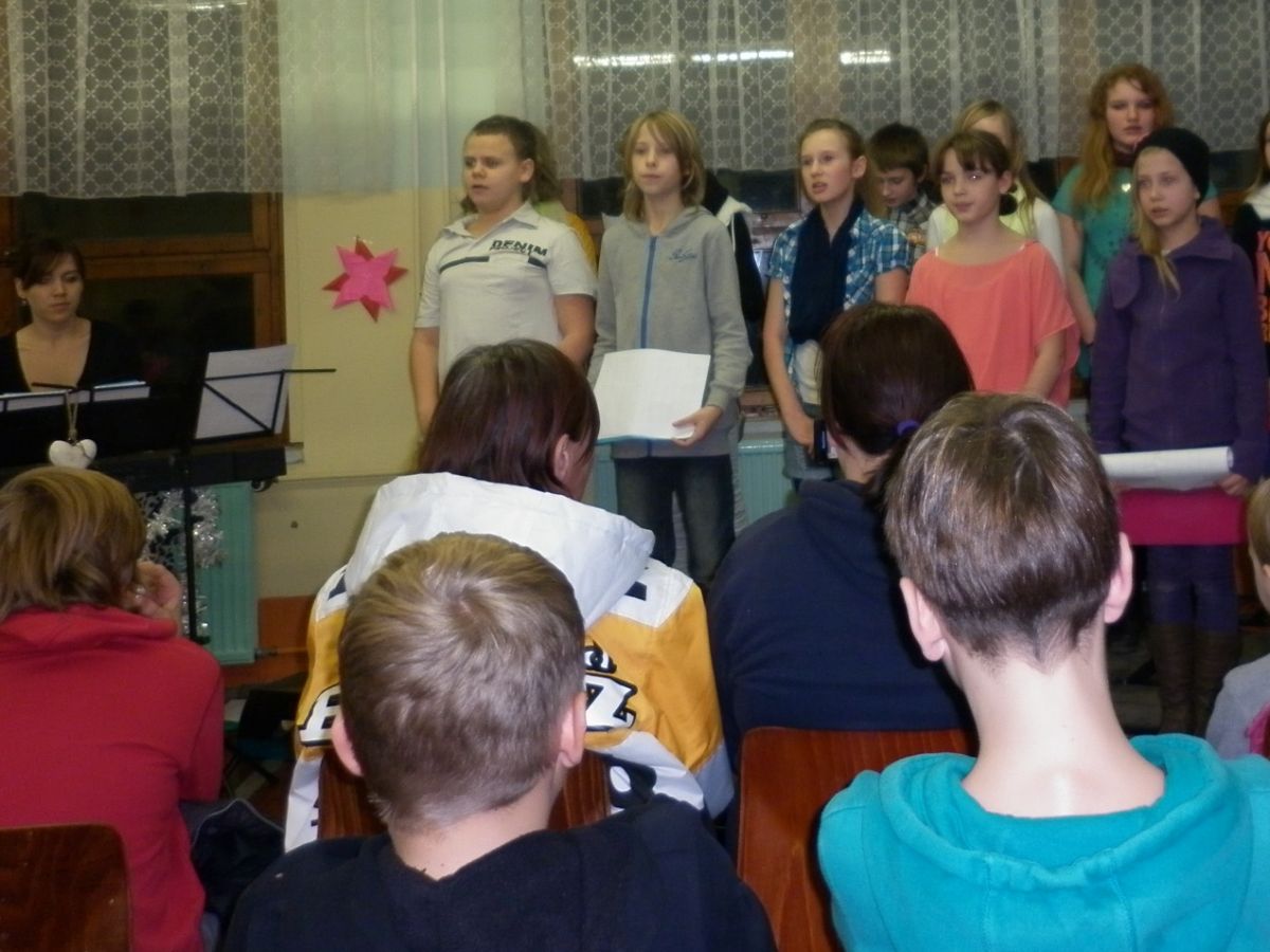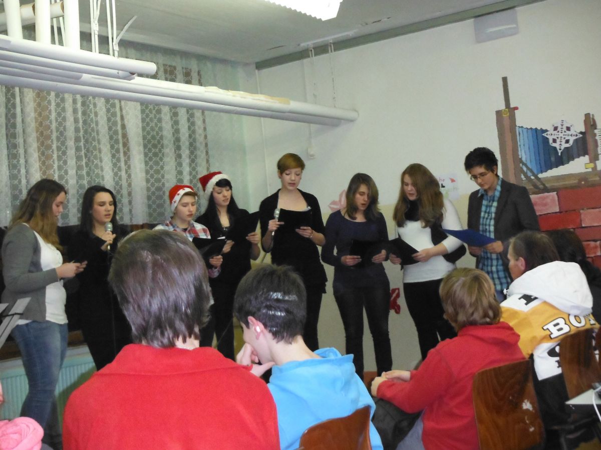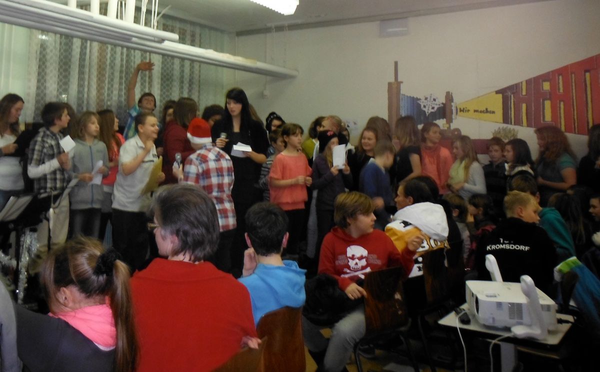 An der Aufführung 2013 waren etwa 50 Aktive beteiligt, die den Speiseraum der Schule in eine vorweihnachtliche Stimmung versetzten. Ein großes Dankeschön an Frau Schmidt, die nach einjähriger Pause (Elternzeit) mit den beieligten Schülerinnen und Schülern ein Programm gestaltete, dass allen Anwesenden viel Freude bereitet hat.
