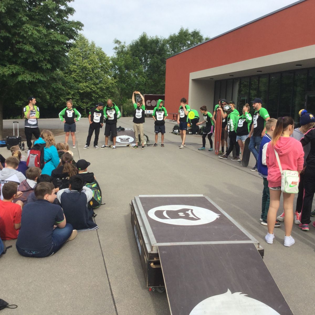 Im Rahmen von „Thüringen denkt bunt“ und als „Schule ohne Rassismus Schule mit Courage“ ist es gelungen, die GORILLAs nach Weimar an die „Musäus“ Regelschule zu holen. Wie die Tourdaten zeigen, waren wir der einzige Stop in Thüringen und die einzige so kleine Stadt! Darauf sind wir mächtig stolz. Sympathischer Chef der 19 GORILLA- Botschaftern ist Tobias Kupfer (Weltmeister im Longboard/Streetskate).